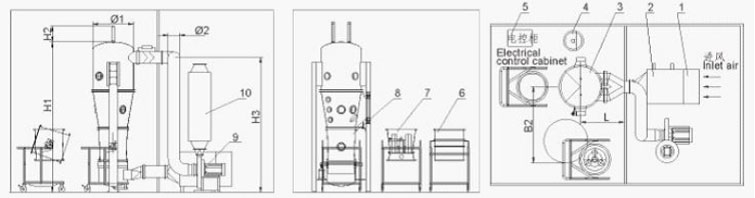 1.過濾器 2.加熱器 3.主機(jī) 4.配液罐 5.電控柜 6.旋轉(zhuǎn)床 7.包衣床 8.制粒床 9.引風(fēng)機(jī) 10.消音器