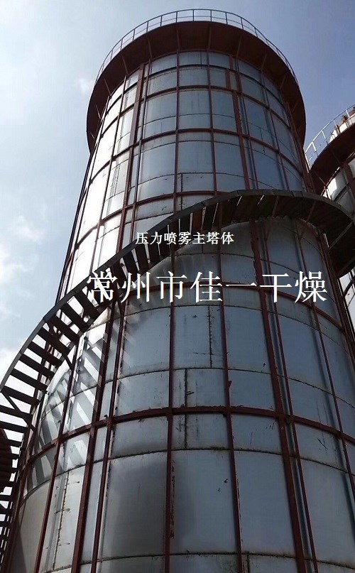本機(jī)組工作過程為料液通過隔膜泵高壓輸入,噴出霧狀液滴,然后同熱空氣并流下降,大部分粉粒由塔底排料口收集,廢氣及其微小粉末經(jīng)旋風(fēng)分離器分離,廢氣由抽風(fēng)機(jī)排出,粉末由設(shè)在旋風(fēng)分離器下端的授粉筒收集,風(fēng)機(jī)出口還可裝備二級除塵裝置,回收率在96-98%以上。