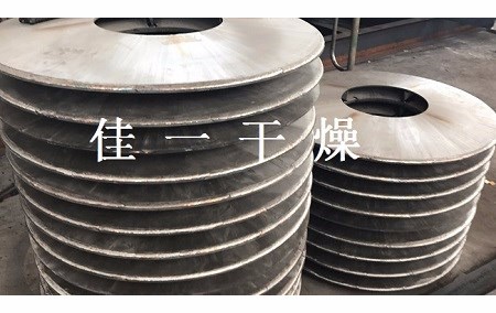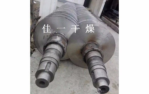 (2)轉(zhuǎn)子:整臺(tái)干燥機(jī)的承載部分,由一根中空軸和一組中空的圓盤(pán)組成。為提高圓盤(pán)的堅(jiān)固性,空心內(nèi)腔按環(huán)形布置幾組支撐桿。在圓盤(pán)的外邊緣裝有推進(jìn)器/攪拌器,同時(shí)起到推進(jìn)和攪拌物料的作用。