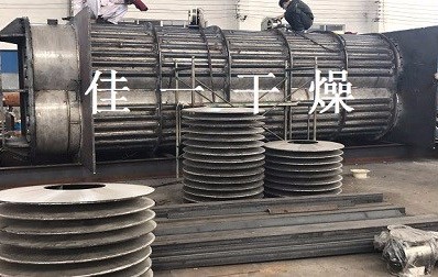 c.高溫飽和蒸汽從與圓盤(pán)干燥機(jī)中心軸相通的旋轉(zhuǎn)接頭進(jìn)入干燥機(jī)的中空軸 中心軸+圓盤(pán) 內(nèi), 中空軸中凝結(jié)的凝結(jié)水再通過(guò)與中心軸相通的旋轉(zhuǎn)接頭導(dǎo)出干燥機(jī)外, 排到疏水箱中。加熱干燥機(jī)外殼的飽和蒸汽, 通過(guò)與外殼外層相連的短管進(jìn)入外殼夾層中冷卻后的凝結(jié)水從外殼下部的連接短管中,排出 到疏水箱中。